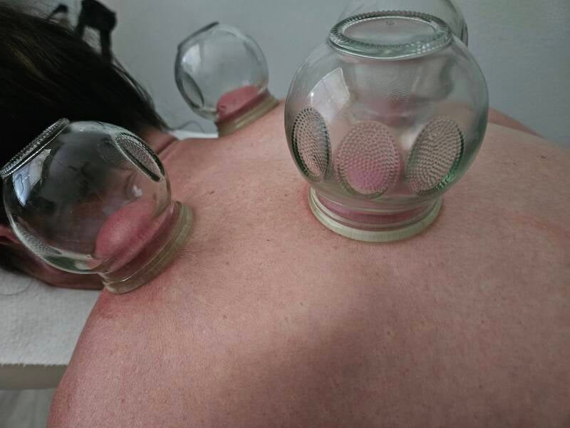 Fire Cupping uses heat to create suction, lifting the skin and underlying tissue to increase blood flow, reduce stagnation, and decrease pain.